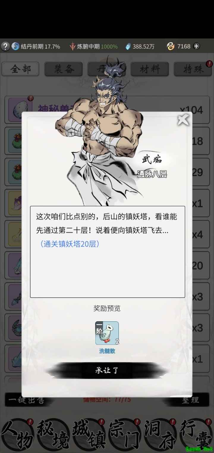 武痴是练武的旷世奇才,他热爱武术,苦练神通,也有着一定的修为。不同境界的武痴总是会同时出现在城镇中,点击城镇界面中“武痴”图标,方可知道该武痴的境界如何。