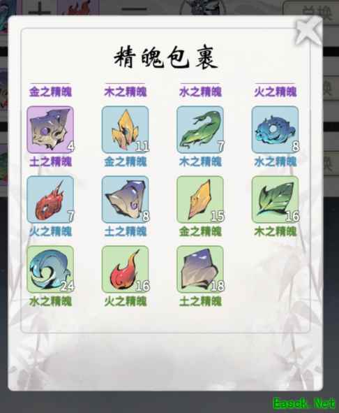 在兑换界面中的精魂包裹,我们可以清晰的看到自身所持的所有精魂及相应的数量。较低级别的精魂可以在行囊中进行卖出。