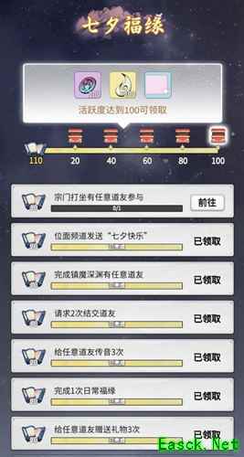 七夕的奖励还算十分丰厚。除了惯例的【签到奖励】外还有【福缘活跃度奖励】,完成活动任务就能直接获得!