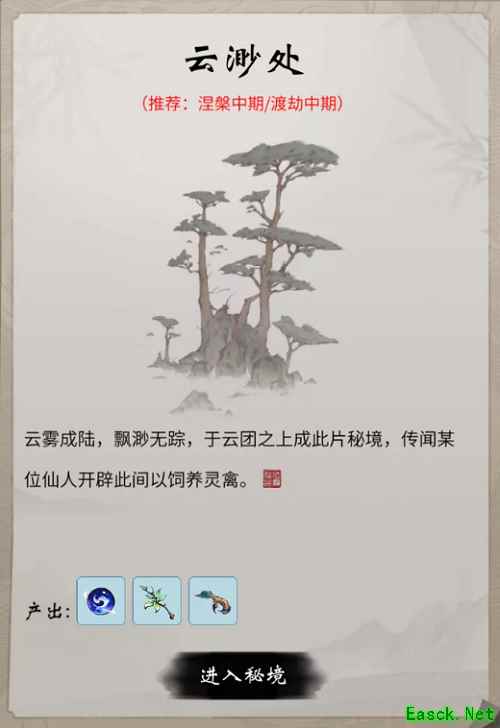 踏入此境,有如脚踏云雾,只需一瞬便飘渺无踪,相传某位仙人为豢养灵禽开辟此间,这里栖息着大量的玄鸟,会对靠近的修士展开攻击,建议涅槃/渡劫中期的修士前往狩猎