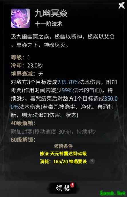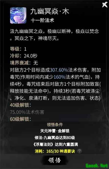 九幽冥焱·木则为群伤技能,会对敌人附加致盲效果,60级后可为自身附加金刚,减少受到的神通伤害。