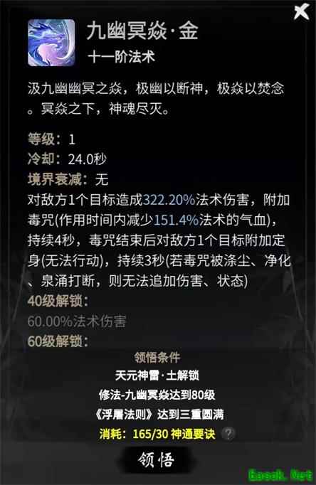 九幽冥焱·金则为控制技能,能对敌方施加毒咒及定身效果,达到60级还可附加神灵。
