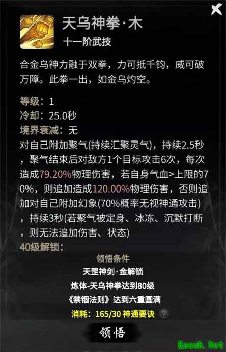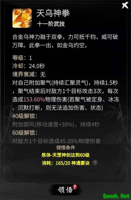 天乌神拳是强力的单体技能,经过持续1.5秒的灵气汇聚后,可对一个敌方攻击3次。
