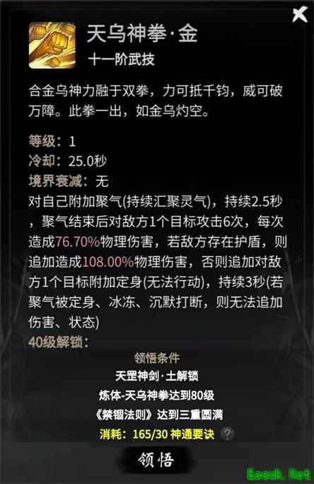 天乌神拳·金着重破障之力,若对手有护盾,会追加物理伤害,否则会将对手定身。