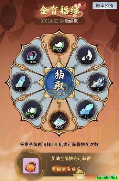 活动期间消耗一定机缘,可获得转盘抽奖次数,总共需消耗5700机缘可抽完所有奖品。