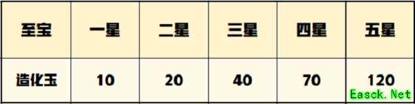 1、至宝最高可升至五星,每次升星所消耗的造化玉也是不同的,具体的升星消耗如下图所示: