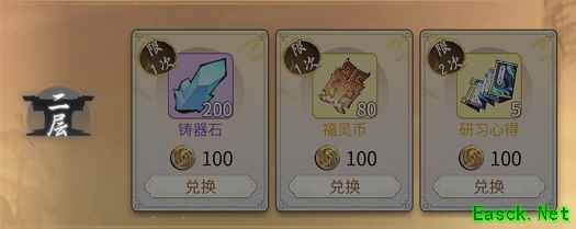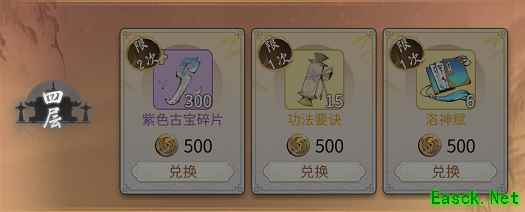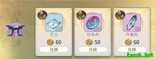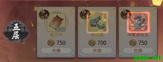 第一层:功法点>灵尘>升星石第二层:福灵币>研习心得>铸器石第三层:神游书>探宝自选>金尘第四层:紫色古宝碎片>功法要诀>洛神赋第五层:鸿蒙造化玉>福灵币>造化露