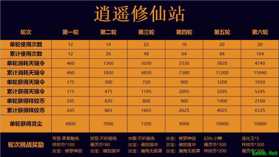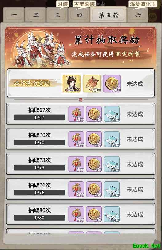 挑战奖励第三轮时装,第四轮觉醒古宝,第五轮小舞幻化、第六轮5个造化玉!