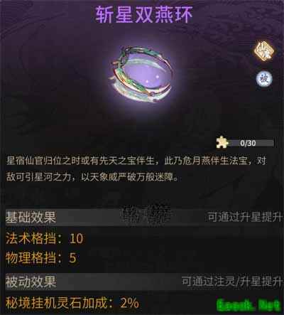 此物乃星宿仙官危月燕归位之时的伴生法宝,环身通体碧绿,暗藏星河之力,作为先天之宝,能以天象威严破万般迷障,增强仙友法术格挡与物理格挡。