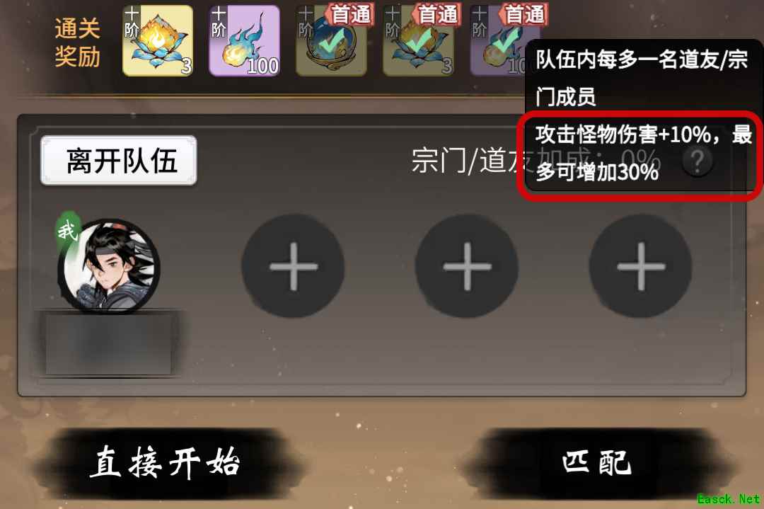 队伍建议是同宗门的四个成员,使每个人都能得到增伤30%的效果。推荐选择三法修一体修,法修在面对群怪时有优势,体修主要负责攻击物攻弱点怪和单个高伤害的妖王。