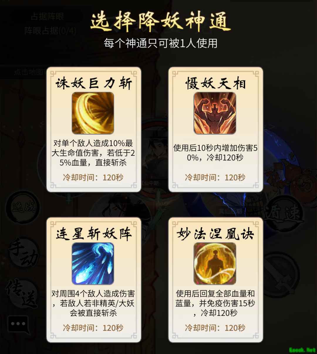 开始时,每人可选择不同的降妖神通。降妖神通的冷却为120秒,用好了会有奇效。