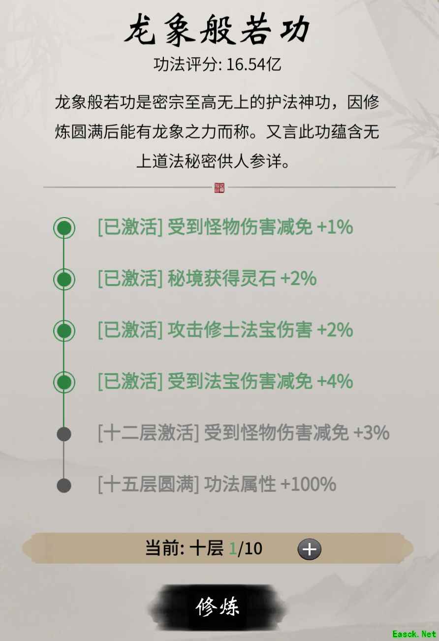 即优先级为:丹药次数>丹药效果>洞府灵气>法宝增减伤>神通增减伤。功法点出所需效果的层数即可,无需点到圆满,如图所示: