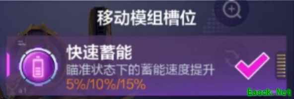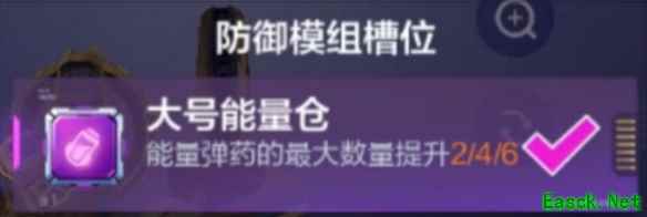 防御模组:大号能量仓(初始模组)审判必备模组,因为审判脆弱的耐久,想有高收益必须用持续的高额攻击弥补,能量仓增加了原弹药60%的量,有其他模组无可比拟的收益