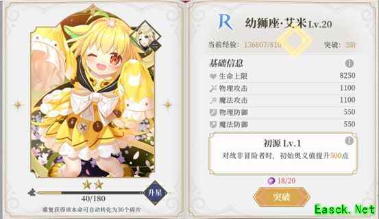 1、幼狮座—艾米:对战非冒险者时,初始奥义值提升500点