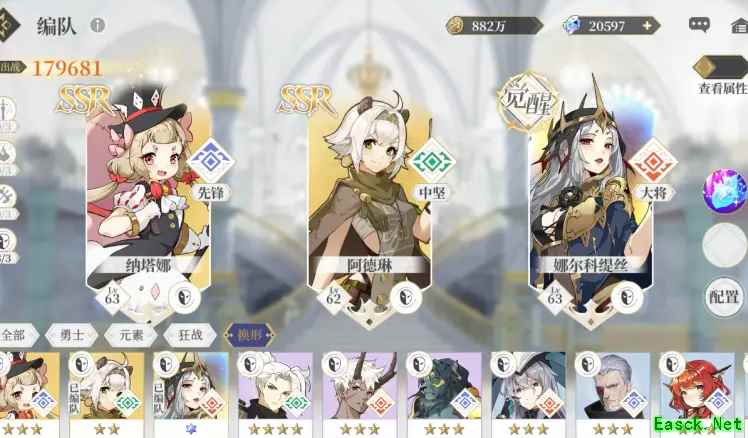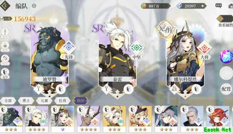 2、低配阵容:迪罗赞+泰雷+娜尔科缇丝。如果没有SSR兔子和熊猫,可以前期用这两个SR来替代,后续再进行更换。