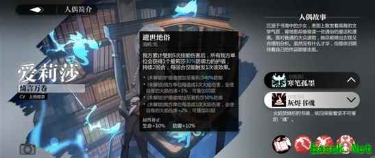 三技能是我方累积爱到5次伤害后,会让我方单位添加一个爱丽莎30%的防御力(升到一级为爱丽莎40%的防御力,三级为爱丽莎50%的防御力)(技能升到二级,我方单位每造成一次火焰伤害,会使自身的火焰伤害+1%,可叠十层,四级为我方单位每造成一次火焰伤害,会使自身的火焰伤害+2%,可叠十层)