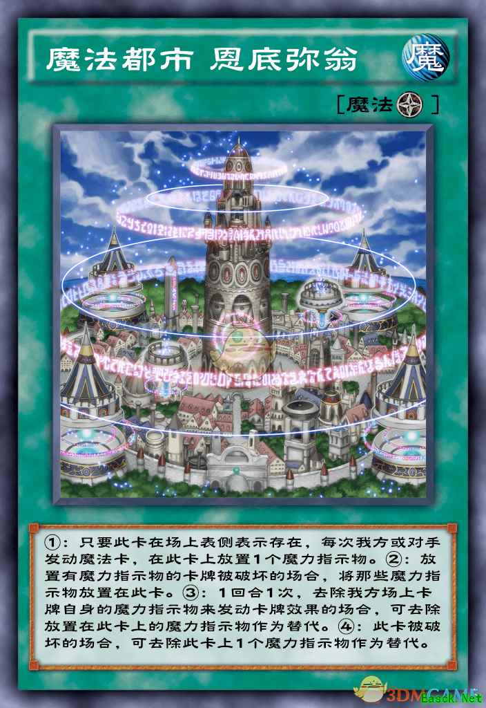 “魔法都市 恩底弥翁”每当双方有魔法卡发动时,会在此卡上放置1个魔力计数物。放置有魔力计数物的卡牌被破坏的场合,在此卡上放置与被破坏卡牌上放置的魔力计数物数量相同的魔力计数物。