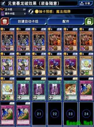 打法:利用元素暴龙特效(有地属性卡在场时破坏对方效果怪兽时,怪兽效果无效)清场,然后等地狱将军削牌。缺点是前期找不出地狱将军的话可能被天胡。搅乱作战也可以换义贼的精奥书给地属性怪削牌。