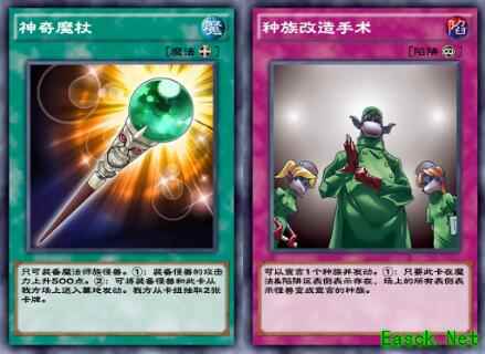 例如:「神奇魔杖」只可装备魔法师族怪兽。在装备中的情况下,发动了「种族改造手术」将怪兽变为非魔法师族,「神奇魔杖」将自动破坏送入墓地。