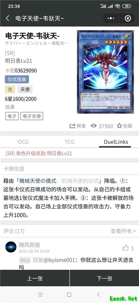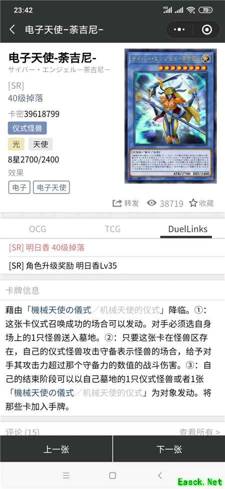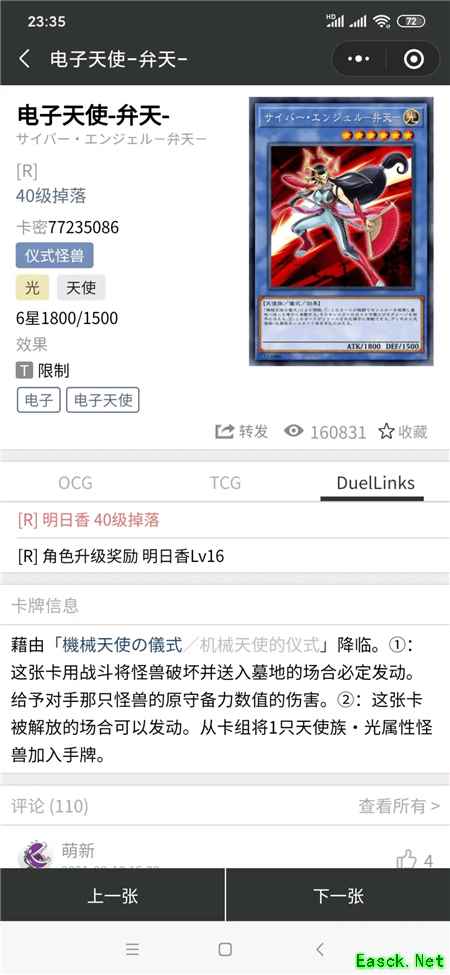 六星1800打点,效果也只是朴实无华的战破抗性,最大的用处应该是被解放后可以检索光属性天使族怪兽,配合机械天使的仪式可以在仪式怪兽出场时检索其他天使族怪兽方便后续展开。