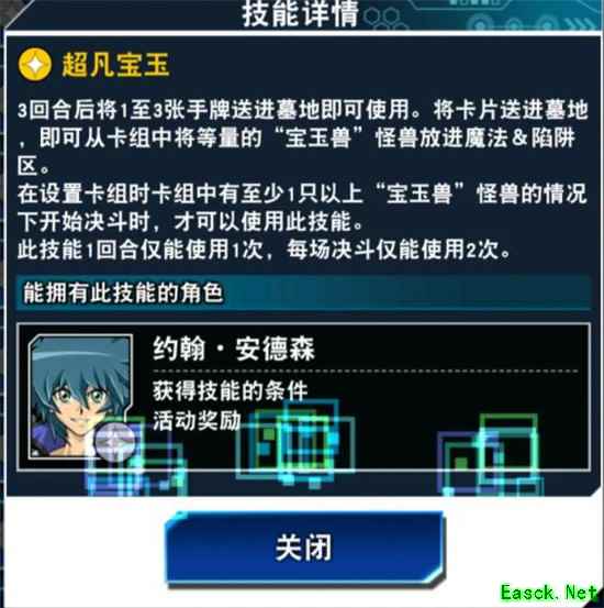 比较强力的一个技能,三回合后可以通过将手牌送入墓地,从牌组中将等量宝玉兽怪兽放置在魔法陷阱区。无论是用于堆墓、压缩牌库还是检索宝玉兽怪兽,都能起到不错的效果。虽然宝玉兽本身比较一般,但这个技能还是建议刷到手的。