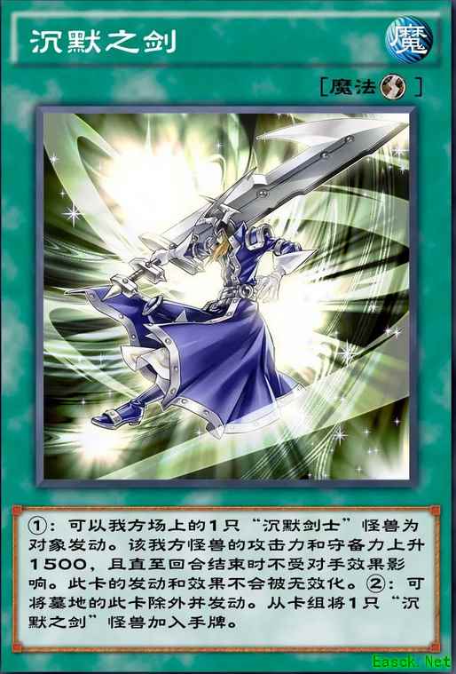 效果:①:以自己场上1只「沉默剑士」怪兽为对象才能发动。那只自己怪兽的攻击力上升1500,直到回合结束时不受对方的效果影响。这张卡的发动和效果不会被无效化。