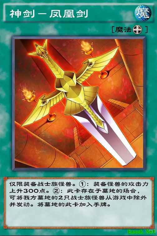 效果:战士族怪兽才能装备,装备怪兽攻击力增加300点,当此卡在墓地时,从墓地把两只战士族怪兽除外,把此卡加入手牌。