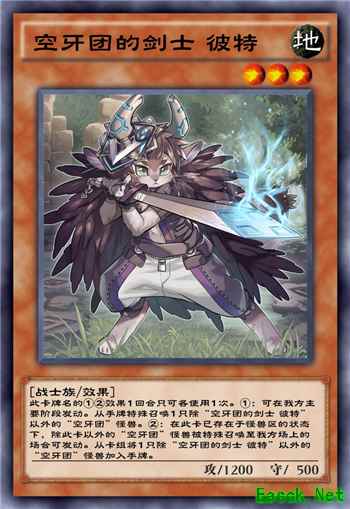 空牙团怪兽下级都有类似的效果,可以特召手上的其他空牙团,并在有其他空牙团特召时触发效果。彼特应该可以算是新包空牙团的核心之一,在其他空牙团特召后可以检索空牙团怪兽,非常不错,是运转的核心,甚至可以打出特召其他下级检索后,再利用下级特召检索的大哥,推荐想玩可能空牙团的玩家优先满三。
