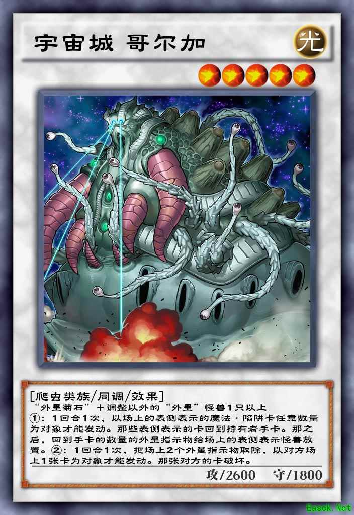 外星菊石加其他外星人怪兽才能用的白怪,作为五星白怪,2600的打点至少能稳压黑魔导一头,作为当前环境内的终端还算凑合。