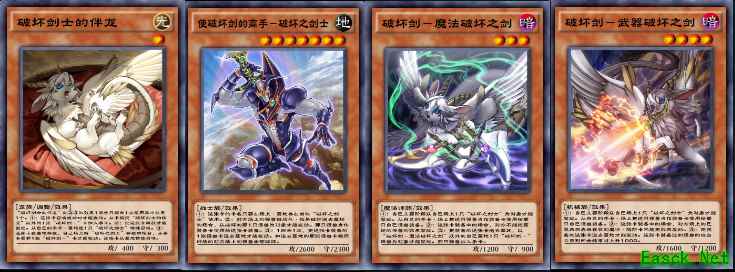 「破坏剑-武器破坏之剑」:以从手卡或场上装备给场上的「破坏之剑士」,此卡被装备了,对面不能发动表侧魔陷的效果。把装备的此卡送墓,装备过的怪兽回合结束前加攻1000。