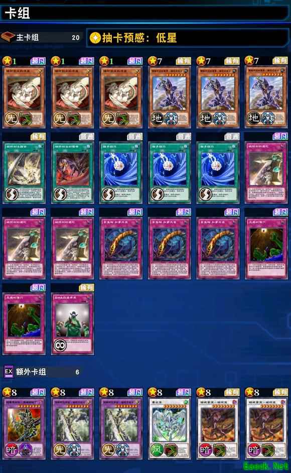 技能携带「抽卡预感:低星」,掉1000生命值可以稳定检索卡组「破坏剑士的伴龙」。因为现在环境有「芳香卡组」的存在,「旋风」比「夜摄」吹贴纸更好用,为了方便扣血也可以携带「骰子旋风」,「无底的落穴」和「古生物 加拿大虫」一类的打断坑适量投入,「DNA改造手术」能直接改变场上怪兽种族配合「破坏剑士融合」直接融对面,卷星的天梯也遇到很多携带「侠客的七道具」和「轮回之珀尔修斯」达到打断、扣血的效果。本家卡以外的构筑空间比较灵活,可以根据自己的卡池选泽清后场、保前场的合适卡片。