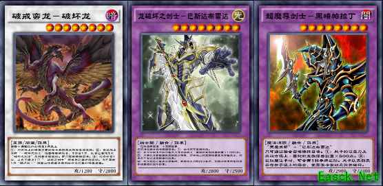 「龙破坏之剑士-破坏之剑士」:此卡在场上,对面龙族怪兽变为守备表示,且不能把龙族怪兽的效果发动。根据对方场上、墓地龙族怪兽数量加攻,攻击穿防。