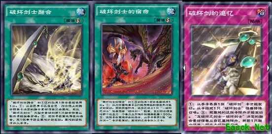 「破坏之剑士」:对方场上怪兽被破坏送入墓地,可以把那只怪兽当做装备卡给此卡装备。可以将此卡装备的怪兽卡送墓,破坏对方场上送墓怪兽相同种族的怪兽。