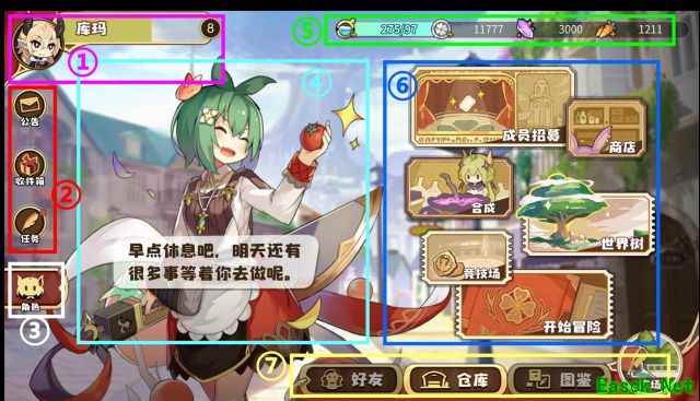 6、右侧主功能菜单区:成员招募(抽卡、精华兑换所)、商店(神秘商店、竞技币兑换所、琥珀兑换所)、合成(道具合成、宝石合成)、世界树、竞技场、开始冒险(冒险大地图);