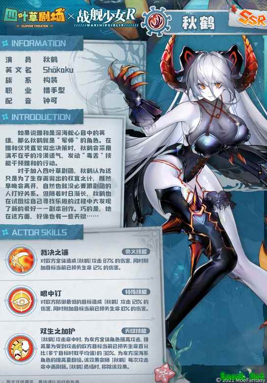 四叶草剧场游戏中的秋鹤是一名与战舰少女R联动的新上线的角色。相信有很多小伙伴不是很清楚秋鹤怎么样,接下来就让小编给大家带来《四叶草剧场》秋鹤角色介绍,感兴趣的小伙伴一起来看看吧。