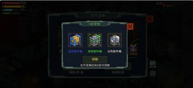 无尽深渊达到第五层之后,能够领取白色配件箱2个,绿色配件箱1个,蓝色配件箱1个,越往下面的奖励就会越高,不过越往下面的难度也会越大。据了解目前无尽深渊已经拥有上百层,但是能够突破100层的目前都不知道有几位。所以如果对自己的技术有信心的话不妨挑战看看。