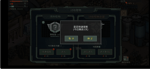 前面有说过的,在熟练度达到3级后,就可进行快速探索了。每天3次探索,消耗10点健康值,稳赚不赔的买卖。