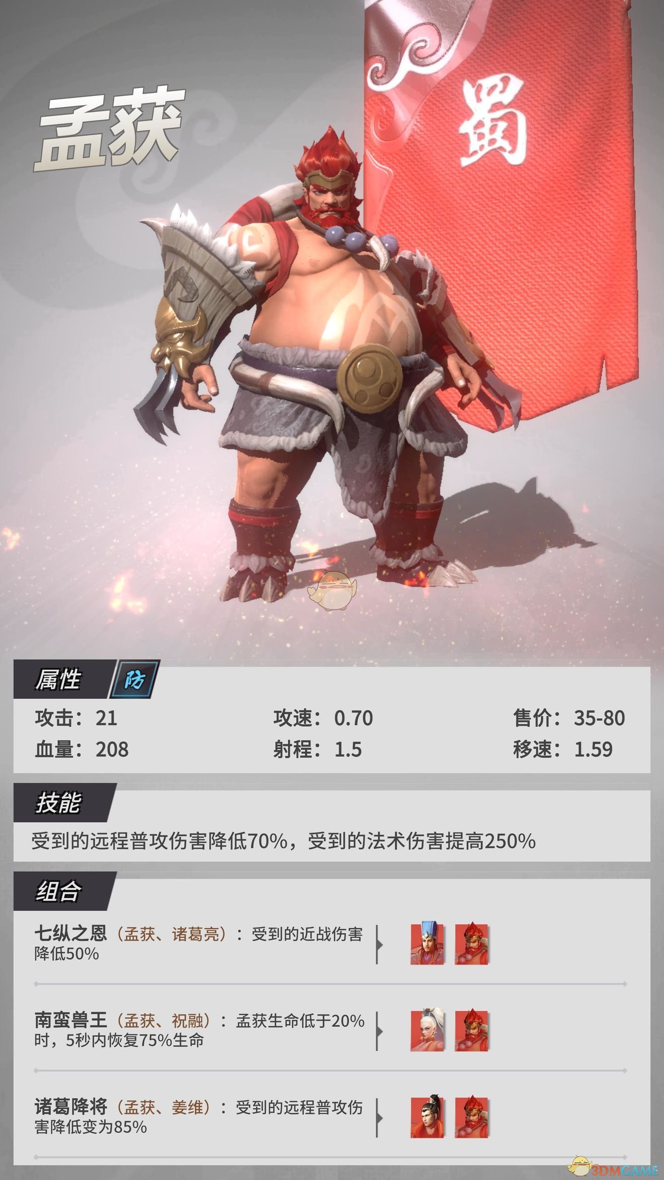 除了与夫人搭档,孟获在与其他蜀国武将组成羁绊组合时,还能拥有额外的效果。比如与诸葛亮同时上阵,孟获就能拥有降低受到近战攻击伤害的技能,如此一来他就只怕敌人的法术攻击型武将了;如果场上有姜维在,同为“诸葛降将”的两人更是能让孟获拥有额外的远程减伤能力。这样的孟获,堪称第一物理肉盾,冲锋陷阵更加强大!