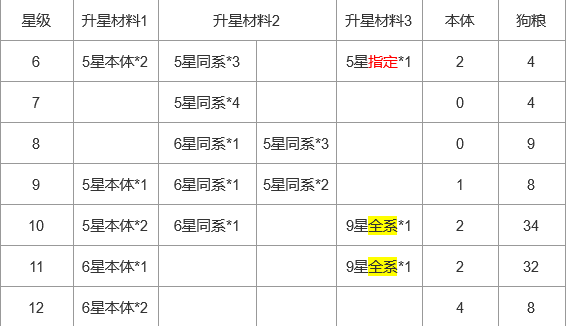 合成6星,需要2只本体+4只狗粮