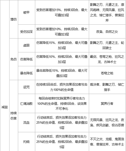 游戏内存在控制与状态,状态分为增益和减益,下面列表整理