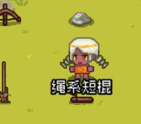 先找到一根长树枝,用尖石削两下得到短木棍。再制作一根绳子,将短木棍和绳子组合在一起获得绳系短棍。
