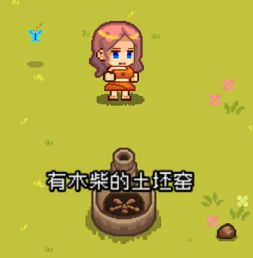 2、 接下来需要生一堆火,生火的流程这里就不过多的去教大家了,如果不知道怎么生火的话就去看第二篇攻略就好。生好火后,用长木棍引火,将土坯窑中的木柴点着。