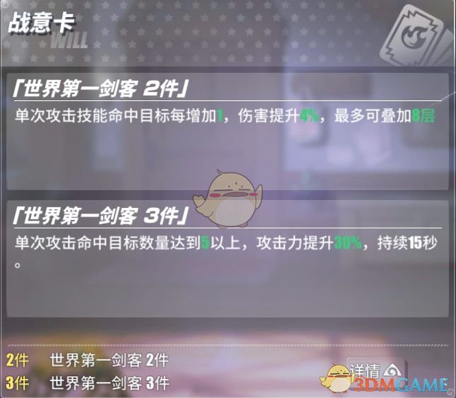 世界第一剑客套装(连击伤害提升):世界第一剑客套装绝对是佐罗在珍宝卡方面的不二之选,他的属性完美适配了他的连击能力,通过连击打满buff后,拥有62%的高额伤害加成,在配合伤害爆表的大招终结,上演血条瞬间消失术;其次这套卡牌的名字和封面都和佐罗有着极深的联系,名字是佐罗的人生追求,封面是佐罗最终的对手,也是让他成长的恩师。相信不管是出于理性还是感性,喜爱佐罗的玩家都会选择这套卡牌。