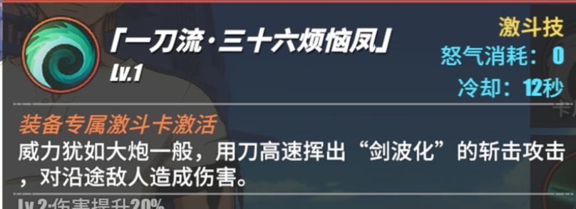 索隆将三把刀放在胸前,做好攻击的准备,封锁住敌方的行动,向前位移突进,对路径上的敌人造成伤害和击飞,一技能是分为短按和长按的,短文的话会对前方的敌人造成伤害,产生小段的位移,但是长按的话就会对前方很远的敌人造成突进并且伤害,也就是一个长形的位移,在技能期间是属于霸体状态的,而且我们在使用技能的时候,可以根据轮盘方向指定的不同,来轻微的改变我们技能释放的位置