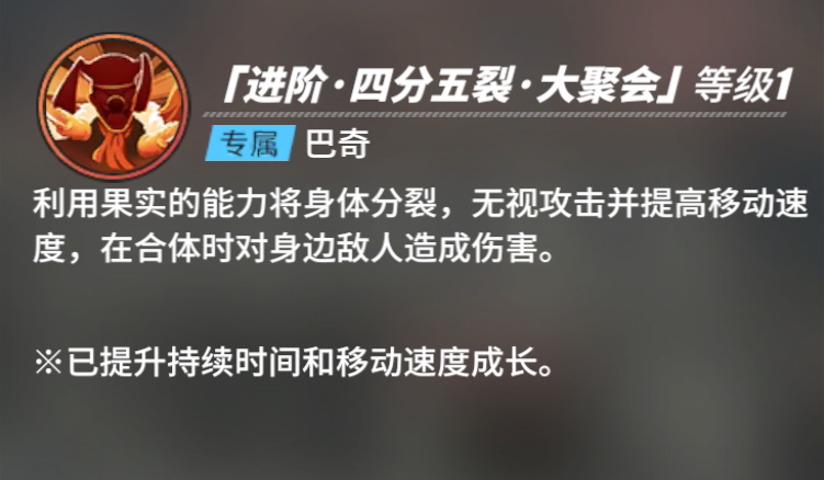 3个卡片技能:【进阶·四分五裂·大聚会】、【进阶·四分五裂·车】、【巴奇弹】。