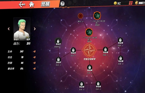 佐罗觉醒分为八阶,每一阶的技能属性增益不同。每一阶觉醒都需要全部属性点觉醒后才可进阶下一觉醒阶级,而每一阶觉醒属性点是根据等级来解锁的。(每一阶暴击属性点无需等级解锁)