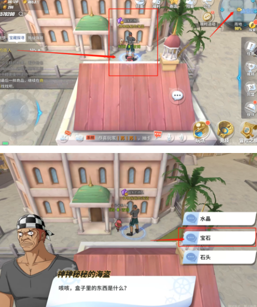 商业街入口的右边小巷子里有个神神秘秘的海盗,和他进行暗号对接,天王盖地虎!答案选宝石!