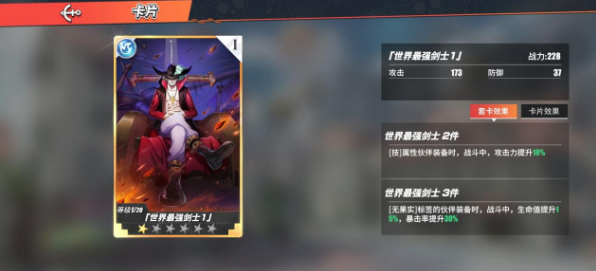 2、后期则推荐携带世界最强剑士卡片,这个套卡对于技系角色以及无果实标签角色都会有属性加成,可以进一步提升佐罗的攻击、生命以及暴击属性。