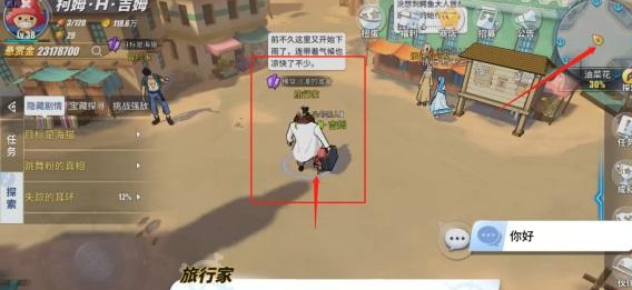 告示牌附近的旅行家咨询你穿越沙漠需要准备些什么东西,推荐防风衣,但因为他体型宽大,只能定做,现在布店老板的排号又排到三个月之后,不知道该怎么办,并说道帮他解决问题会给一张藏宝图,咱们先去问问布店老板呗。