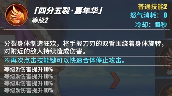 四分五裂·嘉年华:分裂身体制造狂欢,将手握刀刃的双臂围绕着身体旋转,对附近的敌人持续造成伤害。